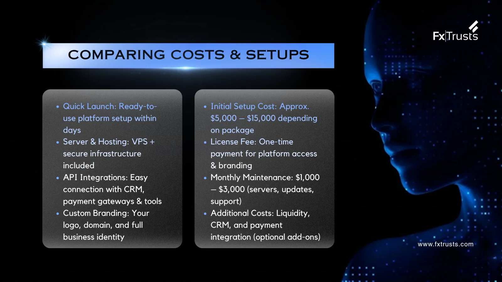 Setups vary: MT5 broker setup solution is streamlined, with providers offering turnkey packages including VPS hosting and API integrations. In contrast, MT4 requires legacy tweaks, and cTrader demands custom plugins for advanced EAs. Expert insights from ForexBrokers.com note MT5's 50% market share growth in 2023, driven by cost-effective white labels. Practical tips: negotiate bundles for lower mt5 white label cost, and factor in ongoing liquidity fees (0.1-0.5 pips). Lisa's case study? Her setup cost $12,000, yielding ROI in four months via 150 sign-ups.